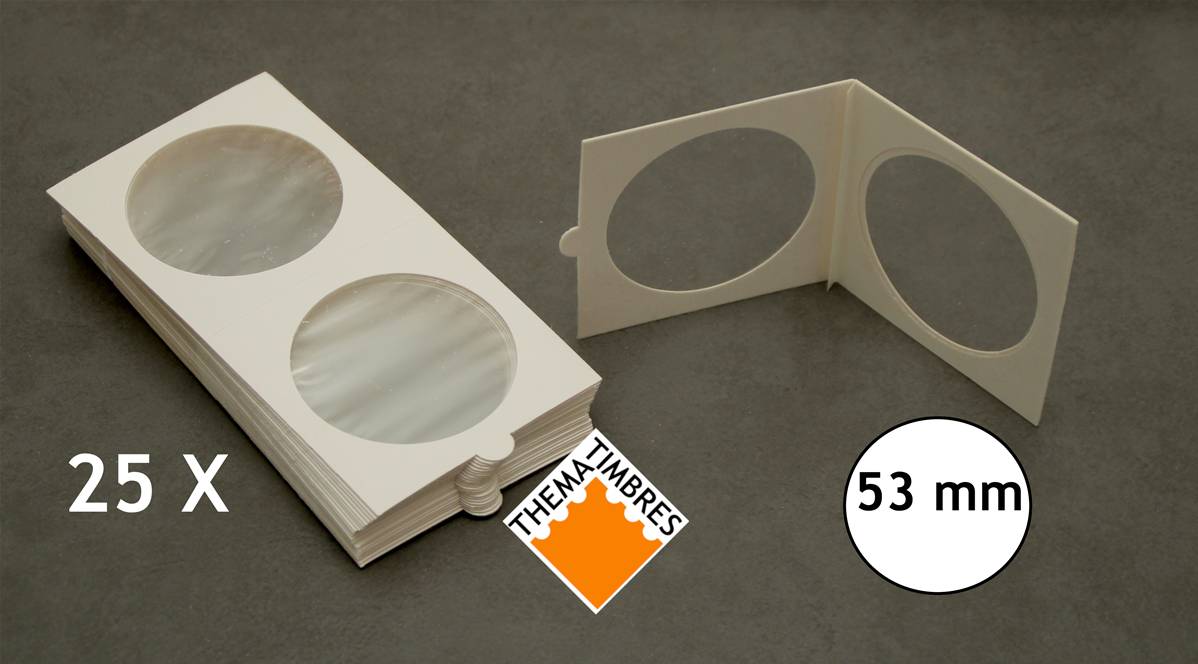 boite originale de 25 étuis numismatiques carton autocollants avec fenêtre transparente diamètre 53 mm.