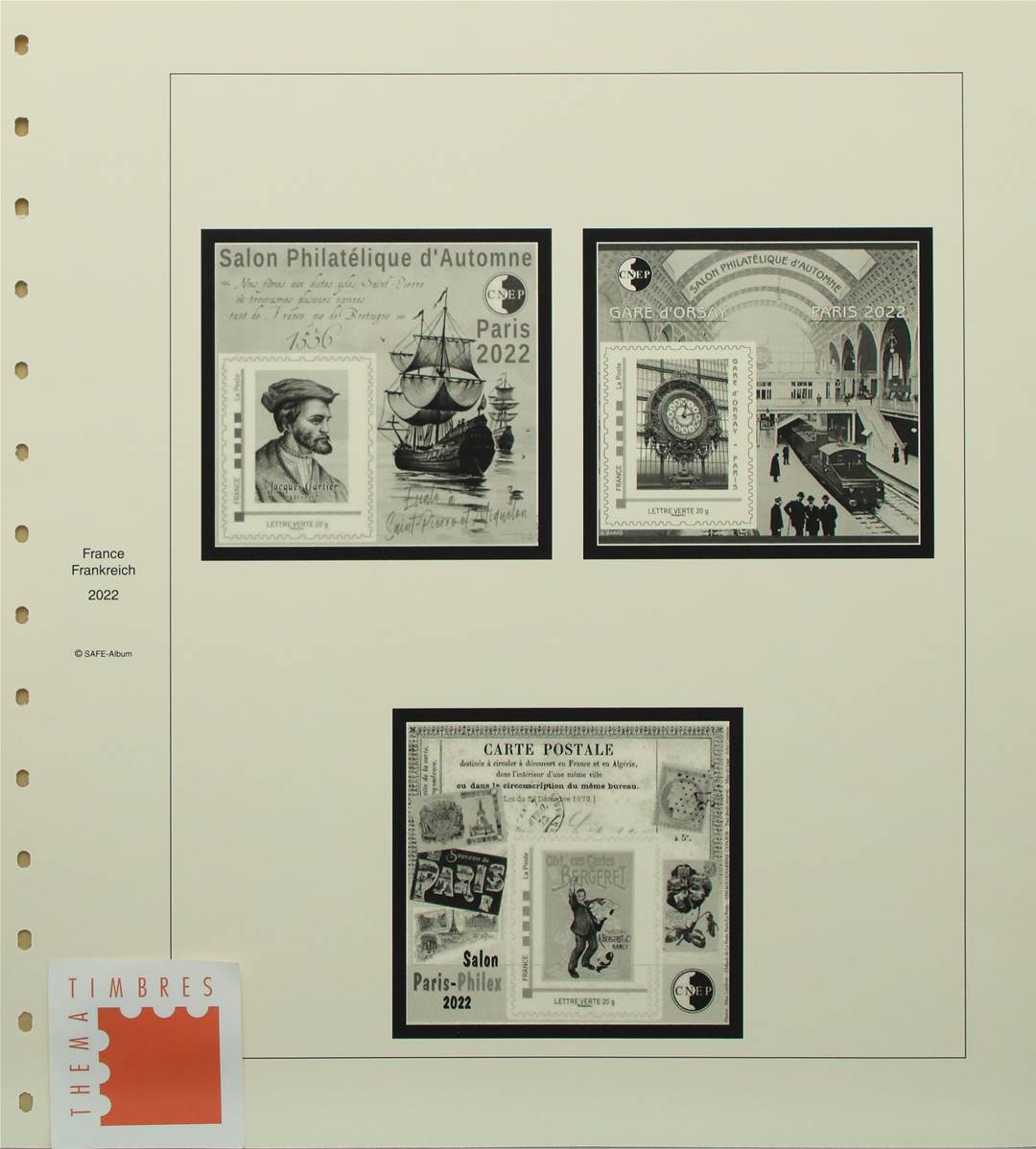 Les feuilles SAFE DUAL sont compatibles avec les reliures YOKAMA. Les timbres sont reproduits en noir et blanc sur une feuille Bristol (170g/m2). Sur la feuille plastique chaque timbre a son emplacement individuel sous bande transparente, il reste donc visible recto verso sans manipulation.