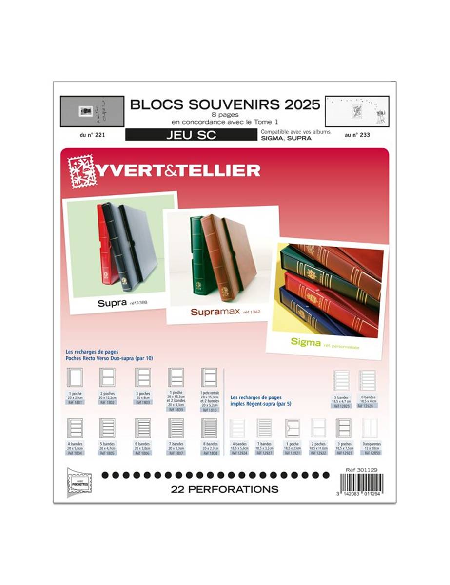 Le jeu SUPRA SC pour les blocs souvenirs de 2025 est constitué de pages bristol 190g/m2 à 22 perforations avec les pochettes transparentes au format du bloc souvenir déjà en place.