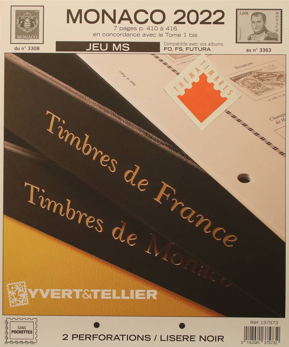 7 pages (410 à 416) pour les timbres émis en 2022 (du numéro 3308 au numéro 3363) par la Principauté de Monaco