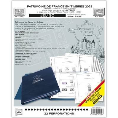 10 pages (BS41 à BS50) pour les blocs "Patrimoine de France" émis en 2023 + 1 page offerte pour le bloc Blaise Pascal